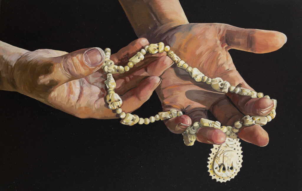 With a cultural heritage in British India, Matthews inherits artifacts that are both family heirlooms and fraught relics of colonialism, culturally relevant still-life compositions that include inherited objects that reflect family history and the legacy of colonialism: a silver spoon that once served Maharajas on a train; an elephant ivory necklace: a parasol handle…